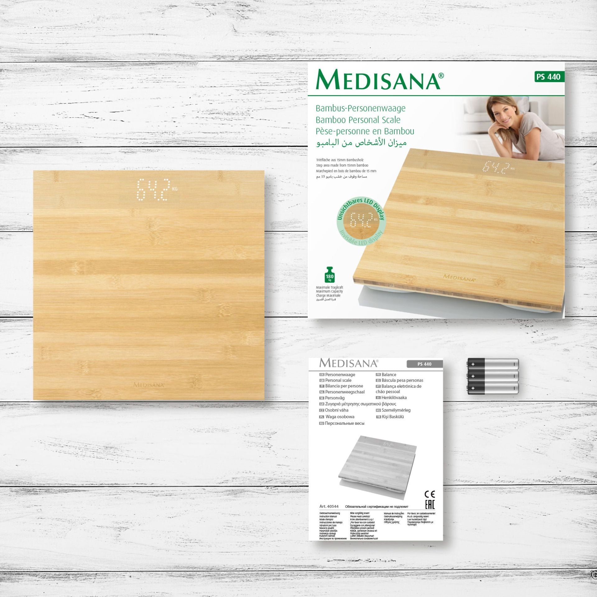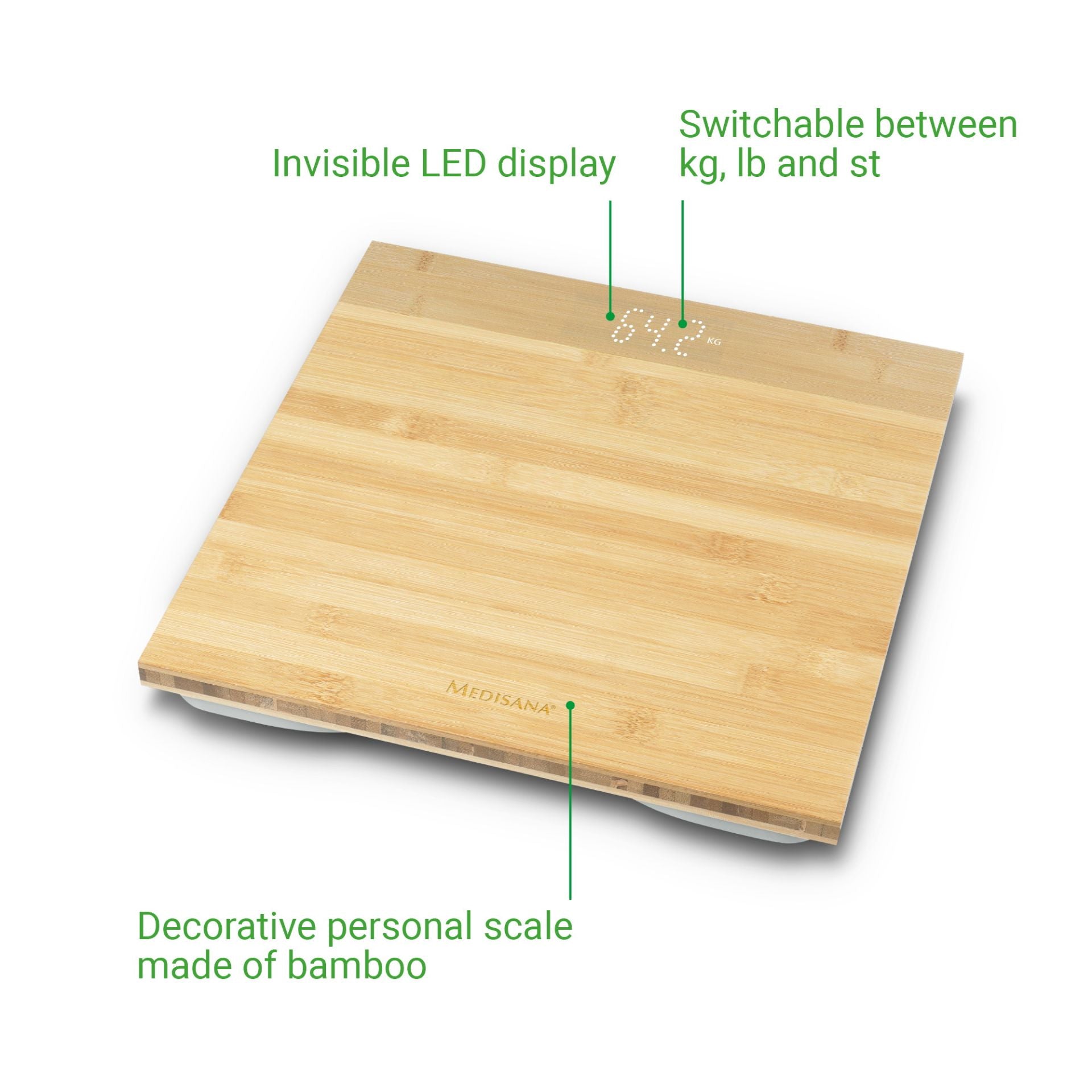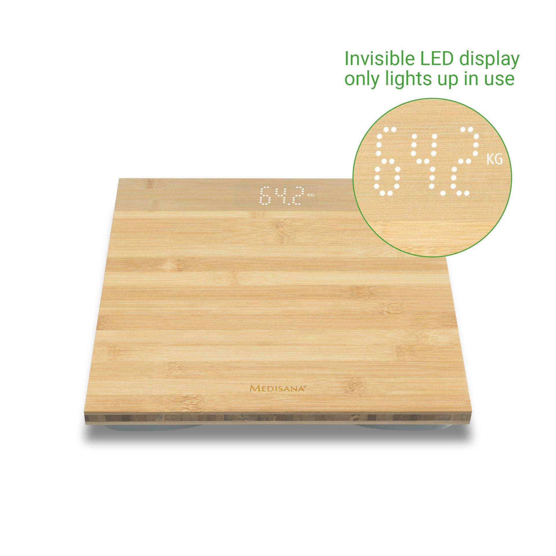 For many people, keeping an eye on their own body weight is a necessity in order to lead a health-conscious lifestyle. Medisana supports this health concept with the new PS 440 bamboo personal scale - a decorative personal scale made from real bamboo. Four high-precision strain gauge sensors guarantee accurate measurement results. Thanks to its invisible LED display, the display on the PS 440 bamboo bathroom scales is only visible when weighing.