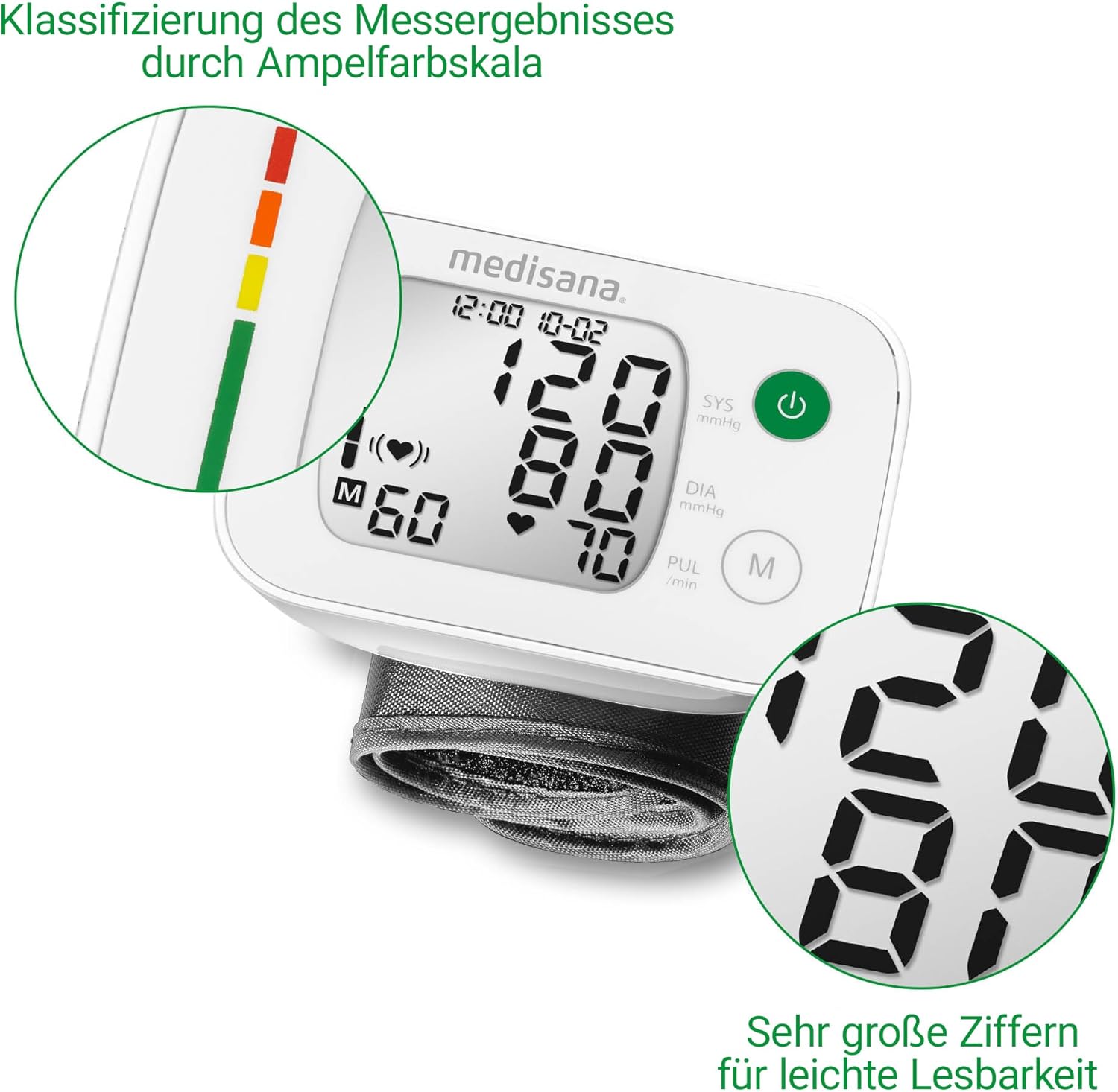 • Medical device: for independent blood pressure control with traffic light colour scale for easy classification of the measurement results. In addition to the actual blood pressure measurement, a pulse measurement also takes place
